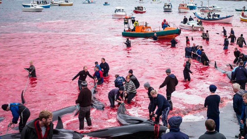 La matanza de 1.400 delfines en las islas danesas Feroe causó indignación. La caza tradicional, llamada «grindadrap», generalmente implica la caza de ballenas piloto de aleta larga y ha sido defendida por los lugareños, quienes dicen que es una fuente de alimento importante y sostenible.